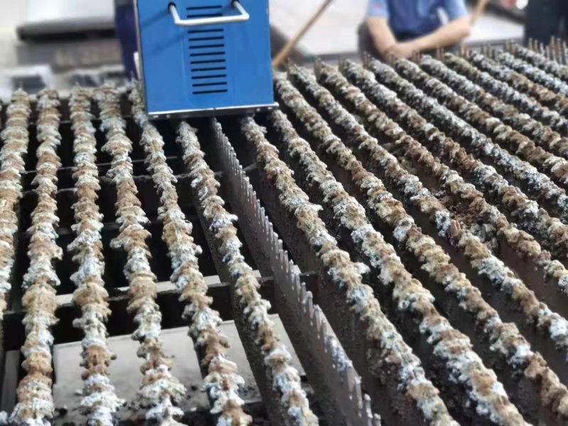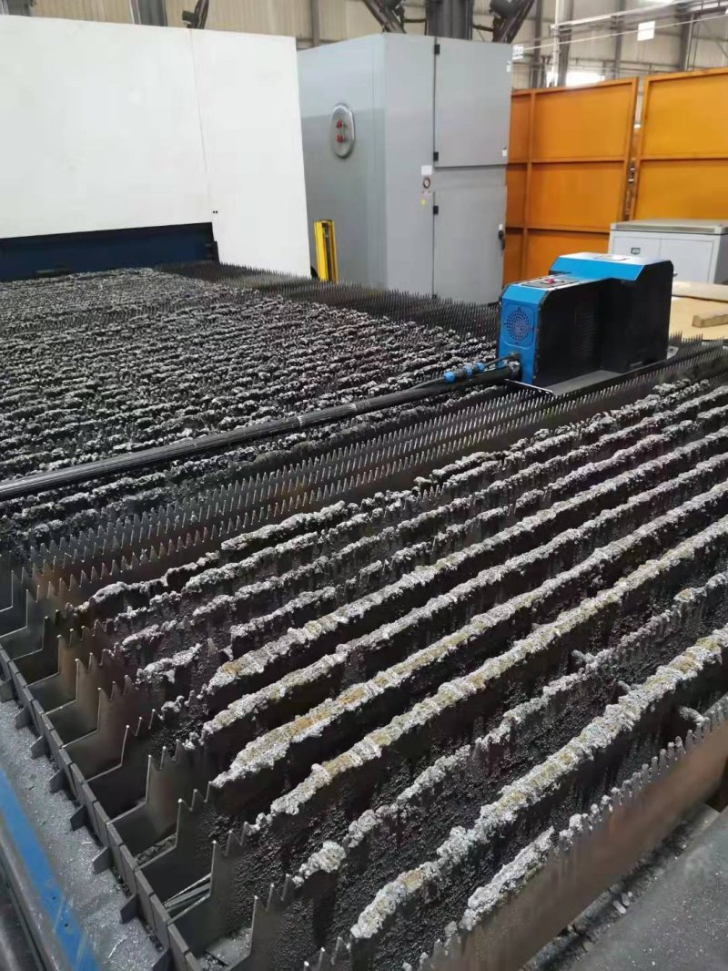激光切割機工作從板材上切割出客戶所需產品,同時會產生熔融狀態鐵水,掉在劍柵上會形成非常堅硬的熔渣,人工去除非常困難,用劍柵清潔機處理干凈、快速、安全!